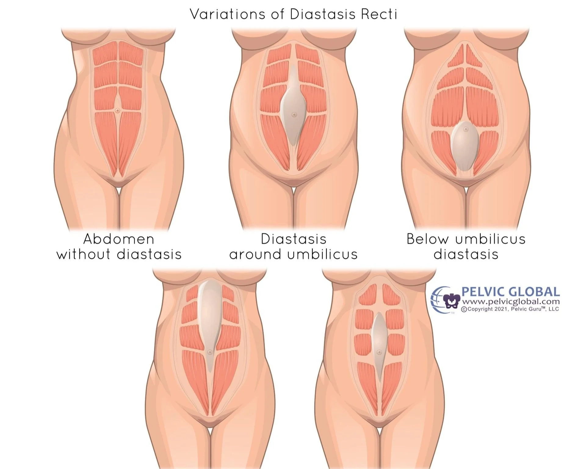 Diastasis recti (or abdominal separation) is defined as increased distance between the rectus abdominus muscles (“six-pack” muscles) along the linea alba (the connective tissue at the midline of the abdomen). The linea alba itself is extremely strong and does not separate or tear, which can be a common misconception.