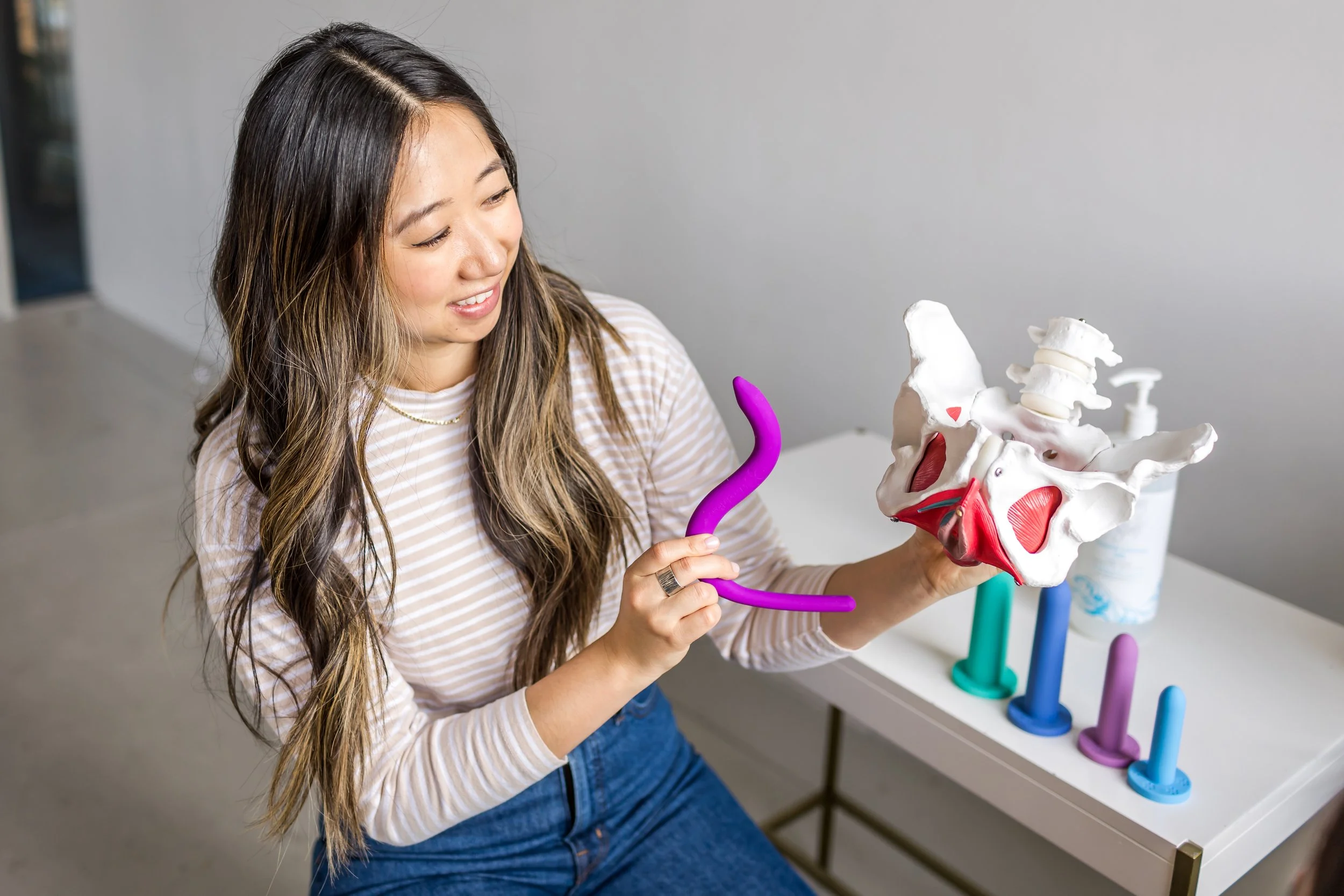 Our pelvic floor PT showing a patient a variety of vaginal dilators and pelvic floor wands. These tools may be part of your pelvic floor PT treatment plan.